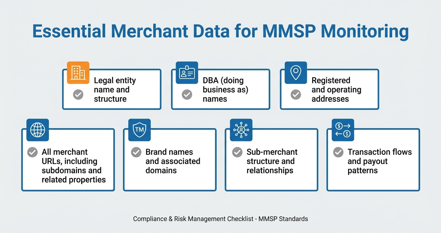 Data submission: The acquirer provides the MMSP with complete merchant information including legal names, doing business as names, addresses, and all URLs. Incomplete data creates monitoring gaps.