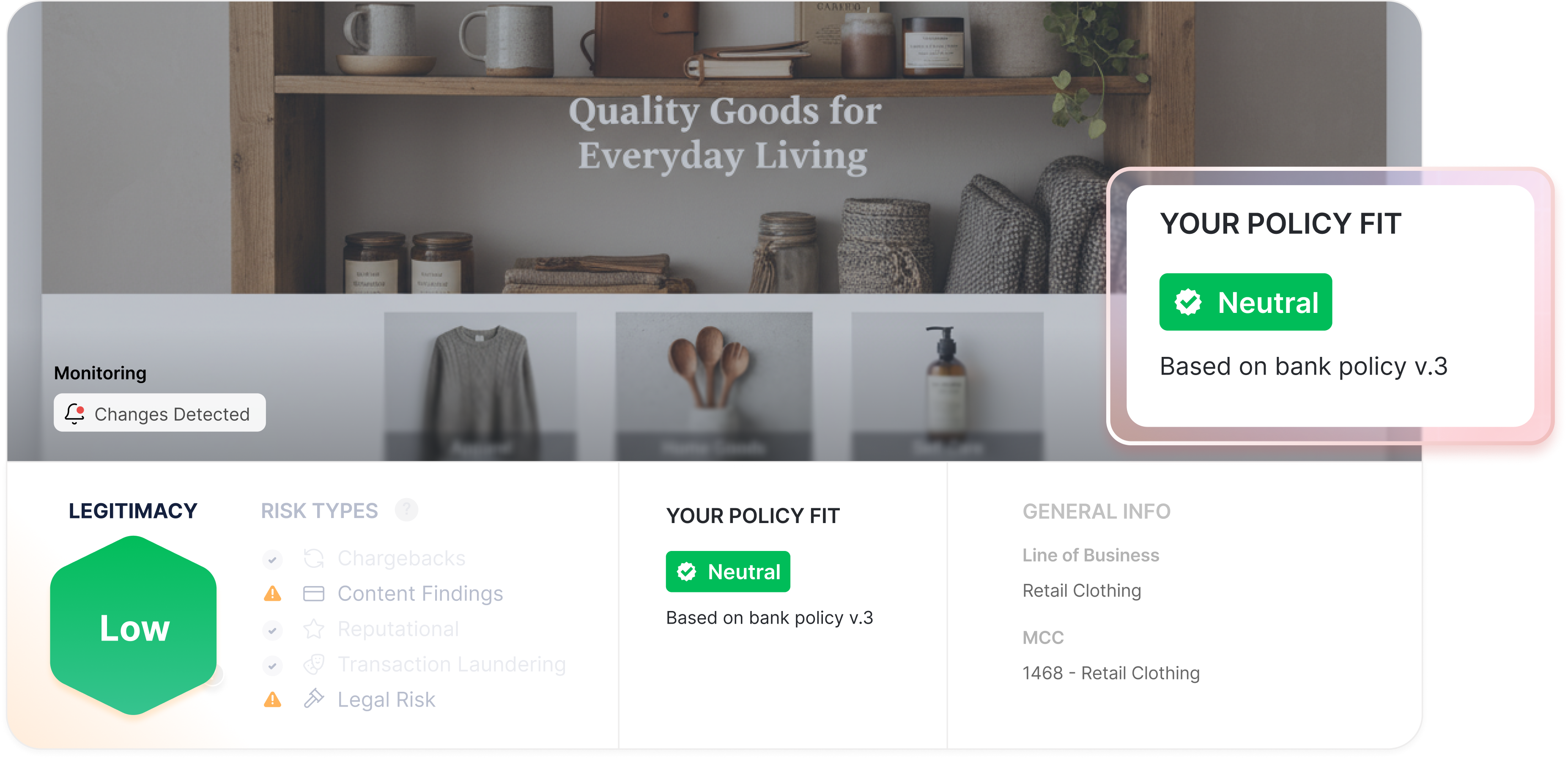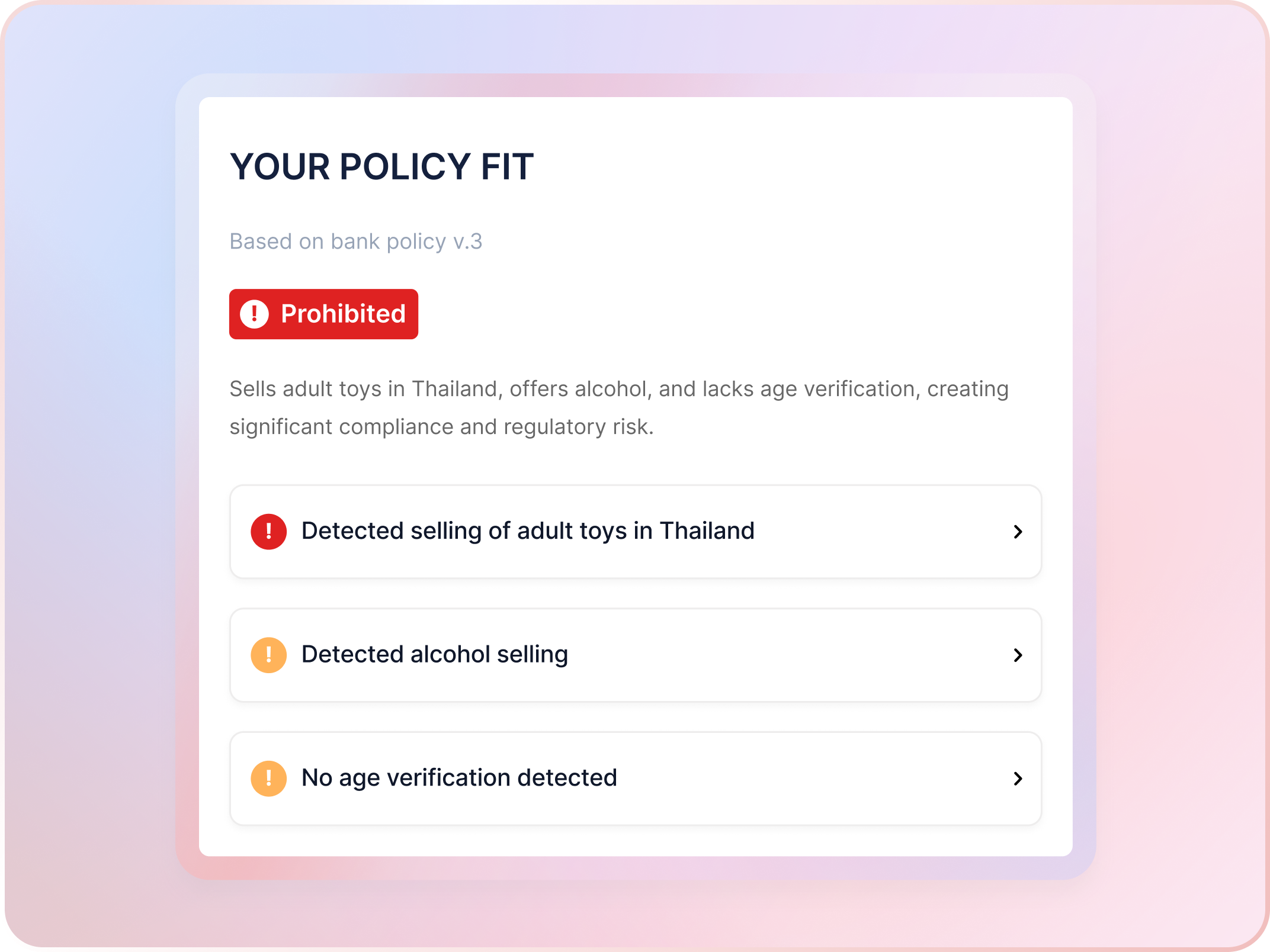 AI powered merchant policy alignment (AUP) that identifies real policy violations with clarity, accuracy, full explainability, and audit ready evidence at scale.