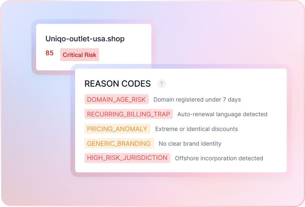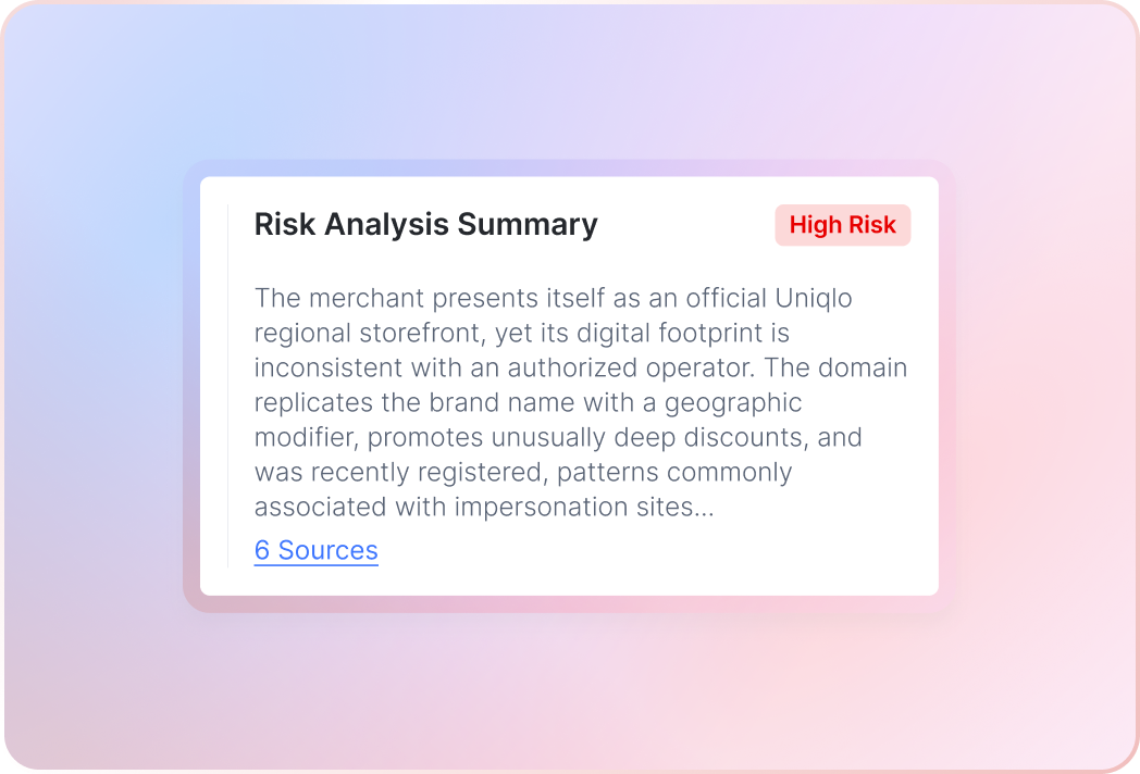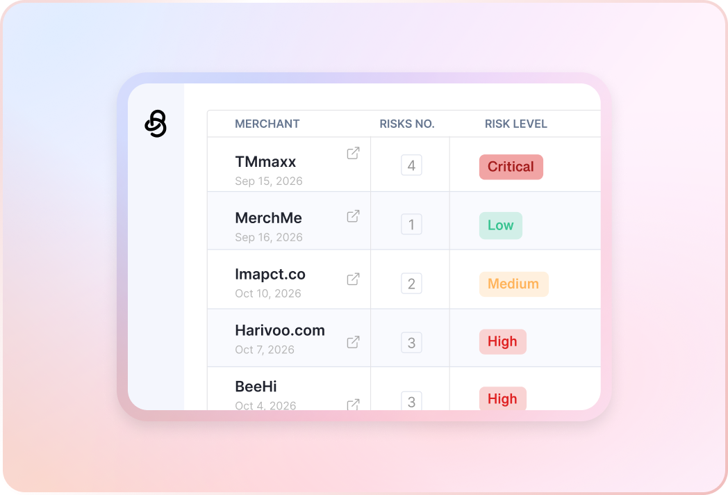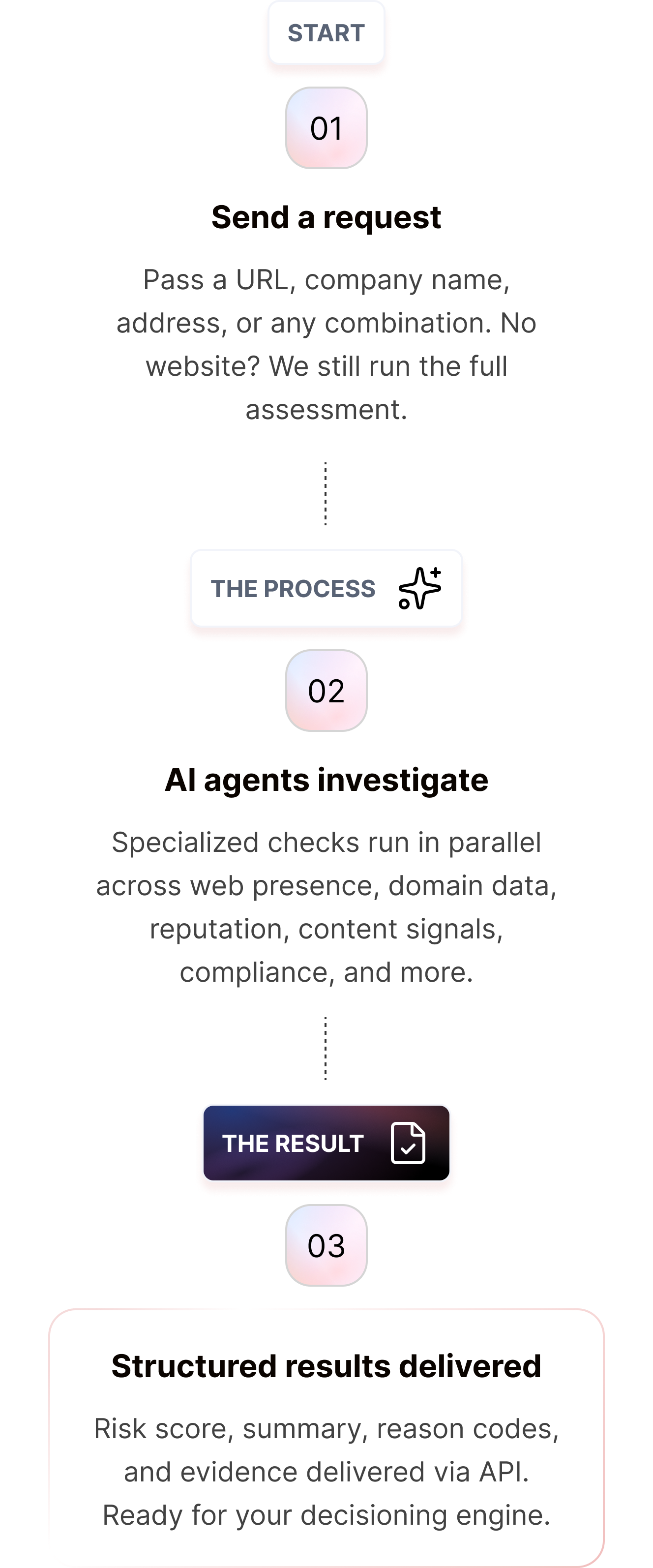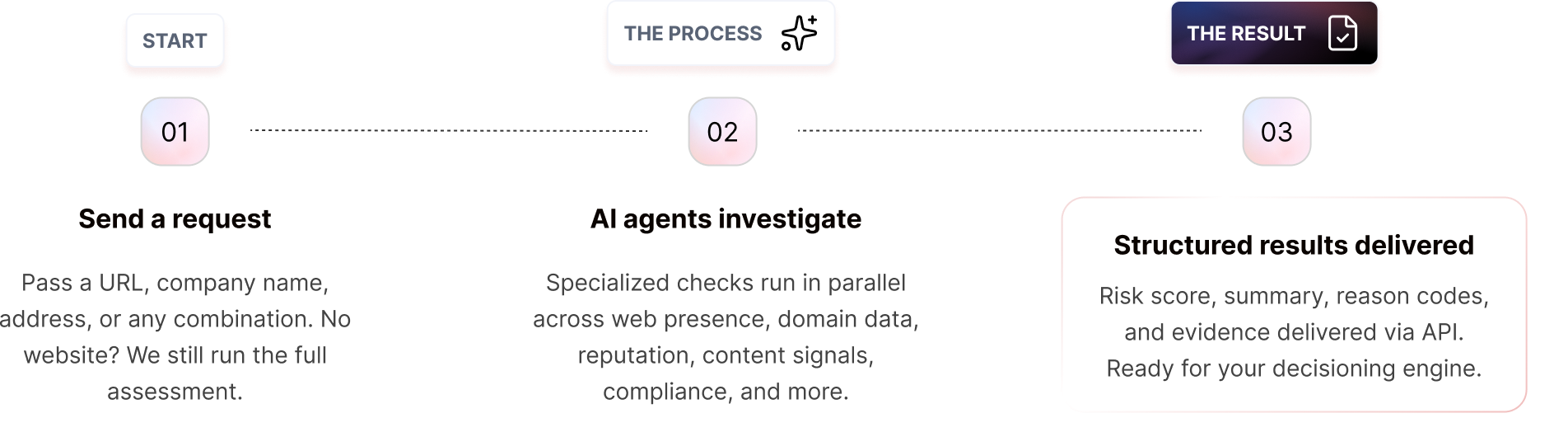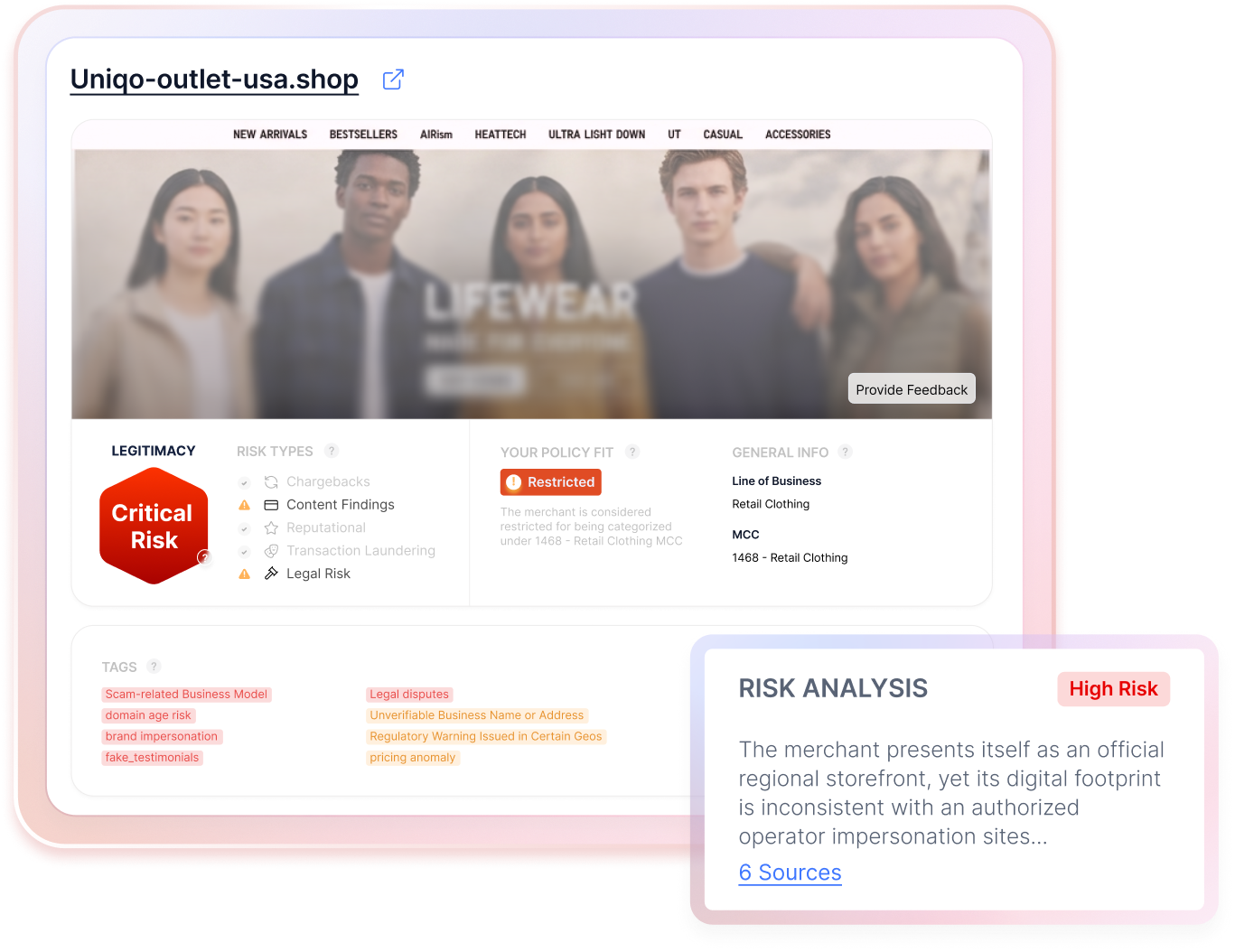 Instant, AI-powered merchant risk intelligence for acquirers, PSPs, and payment facilitators so by the time a merchant finishes applying, you already know if they're worth onboarding.